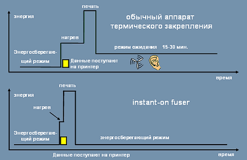 Отличительной чертой технологии instant-on fusing является то, за счет примененной методики нагрева, значительно сокращен режим ожидания. Таким образом, отпадает нужда в применении вентилятора, повышается производительность, плюс, сохраняется низкий уровень энергопотребления системы в целом. Что касается шумовых характеристик принтера, то стоит отметить, что буквально в считанные секунды после конца печати задания вы можете просто забыть о том, что принтер включен, ждущий режим является фактически бесшумным, принтер переходит в него сразу же после окончания печати.