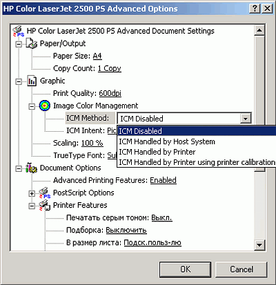 Несколько слов об установках для других драйверов: если панель настроек для версии PCL5c практически схожа с вышеприведенной, для PCL6, то настройки под PS3 обладают специфическими, более профессиональными установками: можно уточнить настройки цветового профиля ICM, разрешение вывода и пр.