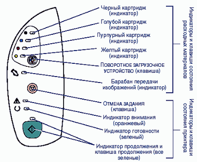 Функциональные возможности панели управления принтером Color LaserJet 2500 сводятся, главным образом, к контролю за наполнением картриджей и индикации текущего состояния печати. Как у большинства современных моделей принтеров, основные функции управления Color LaserJet 2500 возложены на ПК. К кнопкам, расположенным на панели управления, вы будете обращаться, скорее всего, лишь при замене цветных картриджей.