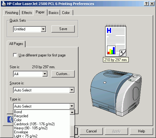 Закладка Paper (Бумага) предназначена для определения размера носителя, с которым вы будете работать, а также для задания плотности бумаги. Дополнительно следует отметить, что для качественной печати на носителях с плотностью, отличной от обычной, лучше будет установить тип этого носителя, а не оставлять установки в положении Auto Select (Автовыбор). Как показала практика, печка принтера более корректно справляется с плотными носителями при точном указании типа носителя.
