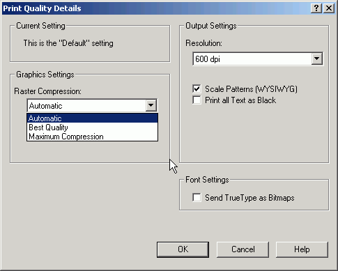 Как видите, именно здесь задаются главные установки качества вывода: разрешение, монохромный вывод, преобразование шрифтов и графики в растр и т.п.