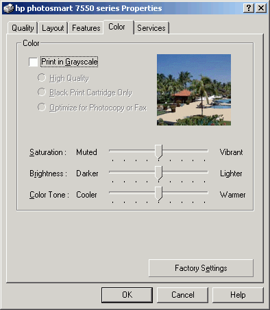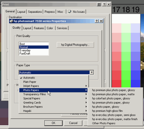 Что касается всевозможных настроек параметров печати, то, пожалуй, меню HP PS 75500 можно назвать одним из самых насыщенных. Это касается и подбора типа бумаги, и баланса цветов, и дополнительных настроек модели. Вот лишь несколько, наиболее красноречивых скриншотов этого меню: