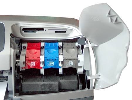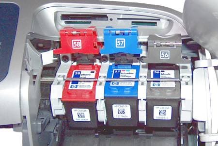 Принтер комплектуется выносным блоком питания, тремя картриджами — черный hp № 56 (С6656АЕ), трехцветный hp № 57 (С6657АЕ), фотокартридж hp № 58 (С6658АЕ), руководством по основным операциям, плакатом по настройке и диском с драйверами и ПО для работы с фотографиями и создания фотоальбомов.