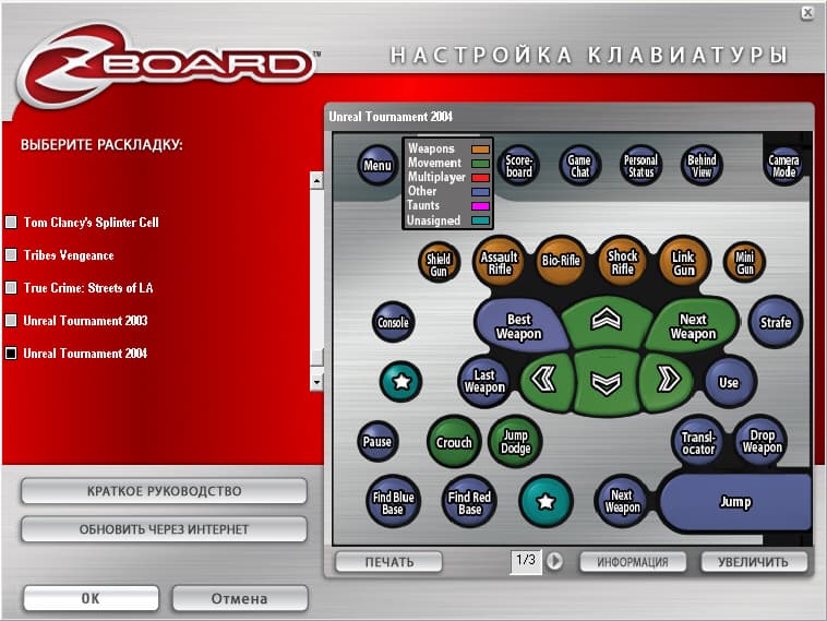После установки игровой панели Zboard преображается и выглядит довольно необычно. Цифровой блок уничтожен как класс, необходимые клавиши радикально смещены вправо, а значительное освободившееся пространство занимает нечто, напоминающее очень замысловатый геймпад. При смене панели программа управления автоматически определяет ее и переключает в соответствующий режим, после чего требуется выбрать в длинном списке раскладку, подходящую для какой-либо из игр (разработчики рассчитывают на конфигурацию клавиш в самой игре по умолчанию). Список довольно внушительный, плюс регулярно обновляется через Интернет, однако, с оперативностью тут туговато, например, раскладки для относительно новых Project Snowblind и Area 51 нам найти не удалось и пришлось назначать клавиши уже в самой игре