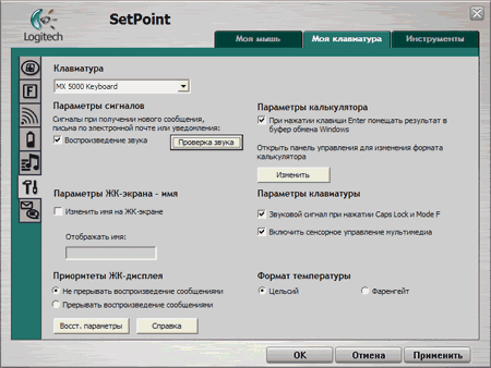 Клавиатура оснащена монохромным ЖК-дисплеем с разрешением 102х42, предназначенным для интерактивного вывода разнообразной информации. Под ним размещены две кнопки для пролистывания информации и две софт-клавиши, как на телефонах. Обычно на нём отображается имя пользователя (берётся информация win logon, возможно редактирование в драйвере), текущая дата и время и температура клавиатуры, что оказалось достаточно интересно. Вся отображаемая информация результат обмена данными с компьютером, кроме градусника и ещё калькулятора, который включается специальной клавишей. Способен отображать результат одного предыдущего действия, но сколько я не жал на прокрутку, он не стал похож на печатающий. А ещё не умеет проценты и вообще кроме четырёх действий ничего не умеет. И ради этого убили возможность управлять курсором с NumPad!