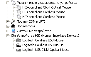 В списке устройств Windows все беспроводные мыши Logitech серии Click! будут выглядеть безлико с одинаковым именем «Cordless Mouse». А вот проводная Logitech Click! Optical Mouse определяется как надо.