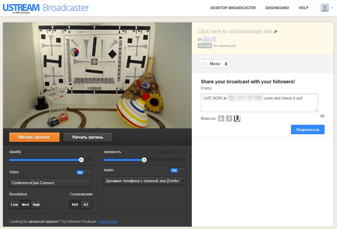 После перечисленных примеров вряд ли покажется удивительным, что рассматриваемую камеру также без затруднений можно использовать в качестве источника видео/аудиосигнала для интернет-трансляций. К примеру, в Ustream не пришлось даже заглядывать в настройки.