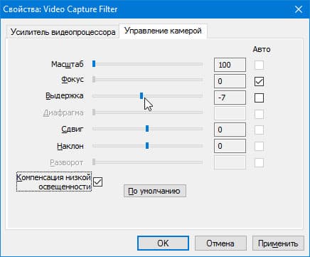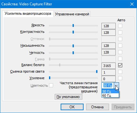Дополнительные настройки камеры (стандартный Video Capture Filter, открывающийся в программах, поддерживающих WDM) позволяют изменить яркость, контраст, насыщенность, четкость картинки, настроить вручную баланс белого, активировать компенсацию контрового света и усиление, выбрать частоту электросети для предотвращения мерцания. Также доступно и управление камерой: электронный зум 4х, ручная фокусировка (!), изменение выдержки, а также сдвиг картинки вверх/вниз или влево/вправо, если перед этим был активирован зум.