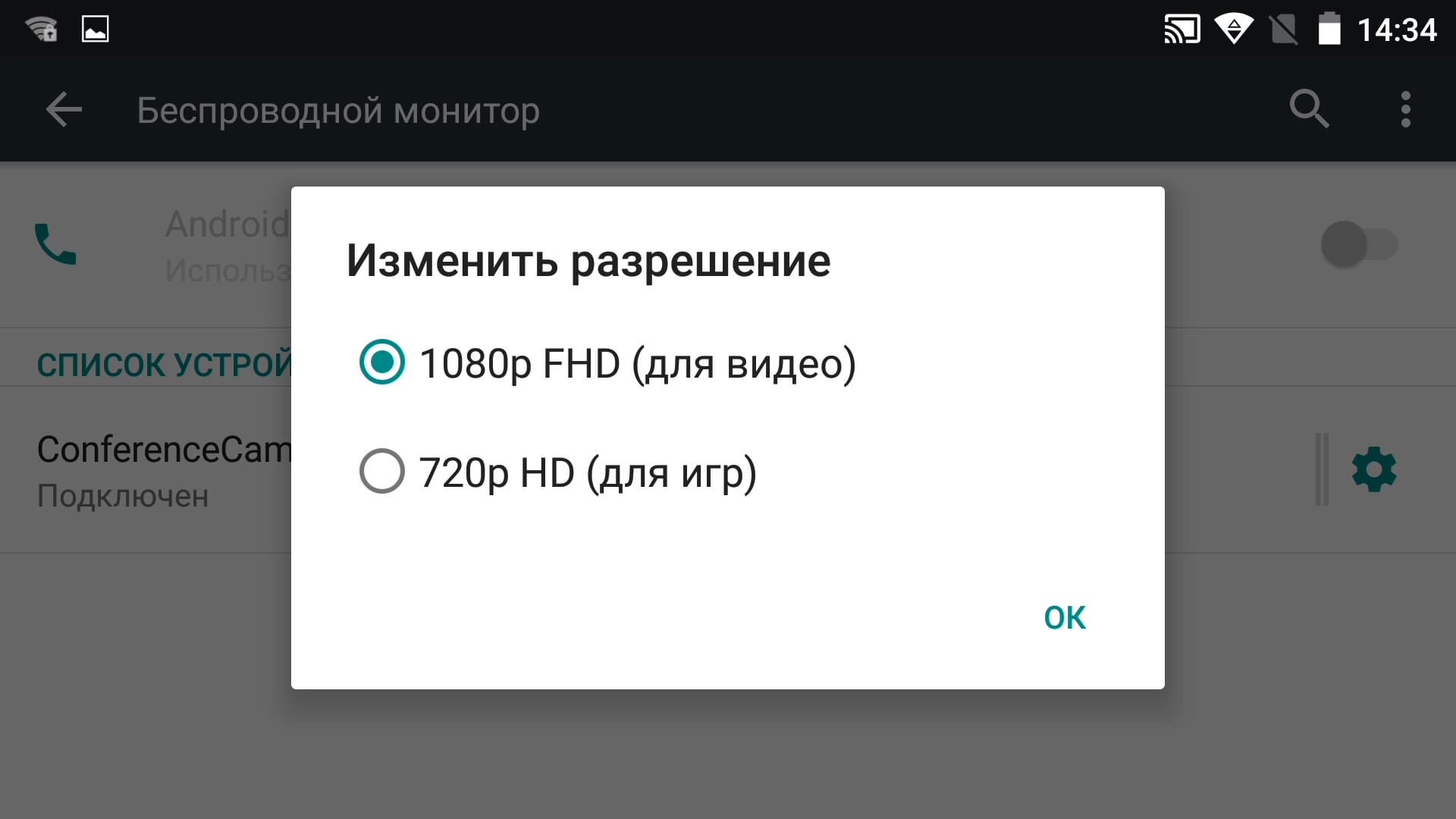 Функциональность USB мы рассмотрели в полном объеме, но для чего нашему устройству требуется цифровой видеовыход HDMI? Изучение этой функциональности привело к легкому разочарованию. Оказывается, видеовыход не предполагает трансляцию видеосигнала со встроенной камеры или повторение интерфейса Skype (хотя такое вообще неосуществимо без внедрения в устройство полноценной операционной системы, «хотя бы» Android). Видеовыход активен только в режиме «беспроводного дублирования экрана». Такой режим основан на технологии Wi-Fi Direct, с помощью которой осуществляется прямая связь между мобильным устройством и устройством отображения информации (телевизор, проектор). В нашем случае камеру можно считать таким телевизором или, точнее, Miracast-приставкой (есть и другие торговые наименования этой технологии: Miracast, Allshare cast, Screen Mirroring, Wireless Output и так далее до скончания фантазии производителей). Суть технологии проста и давно известна: при ее активации телевизор выполняет функции дисплея смартфона, только большого дисплея, который виден всем присутствующим. Очевидно, что такое дублирование экрана может потребоваться в случаях, когда картинку со смартфона нужно вывести на большой экран или проектор.