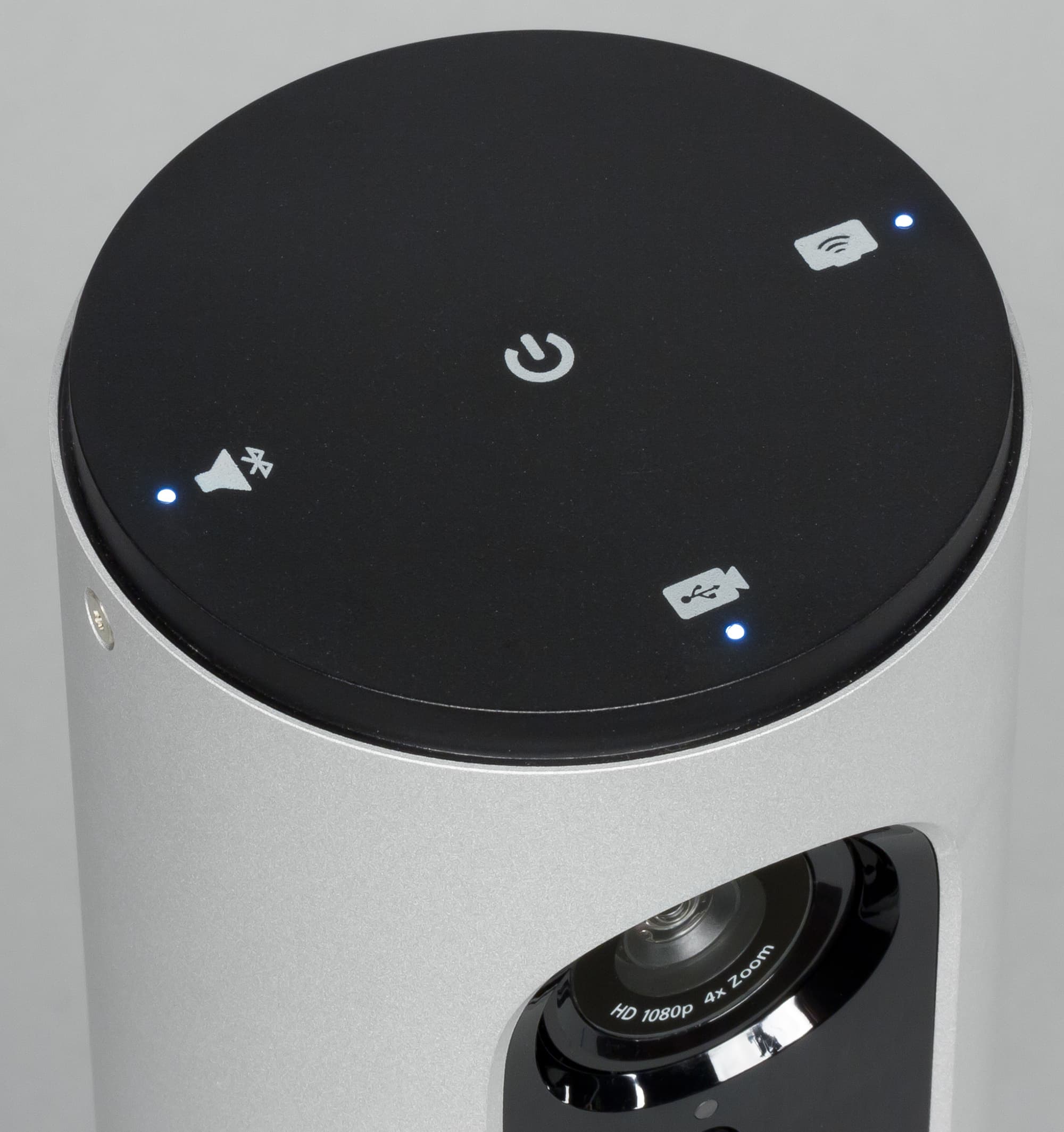 Верхняя крышка цилиндра содержит четыре сенсорных кнопки, которые активируются легким прикосновением: включение системы, активация режима беспроводного дублирования экрана, запуск связи по Bluetooth и переход в режим видеоконференции. Эти пиктограммы подсвечиваются белыми точечными светодиодами.
