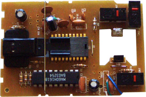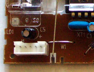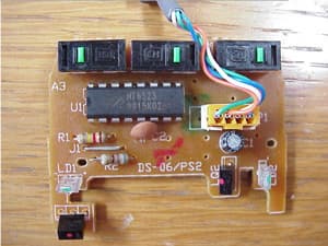 Рассматривая разъем интерфейсного кабеля, сразу же, окунемся в историю. Обратите внимание на фотографии печатной платы мышки M-S35 и ее подделки, которые я привел чуть выше, описывая различия интерфейсных кабелей. На этих фотографиях хорошо видно, что и в случае оригинальной мышки, и в случае подделки, интерфейсный кабель соединен с печатной платой через разъем. Так было в давние времена. На сегодняшний же день, в этой части конструкции оригинальных мышек Logitech ничего не изменилось, а вот производители стали скупы и денег на разъем, они явно пожалели. Смотрим на современные фотографии мышек Logitech M-BD-58, M-BJ-58, и их подделок.