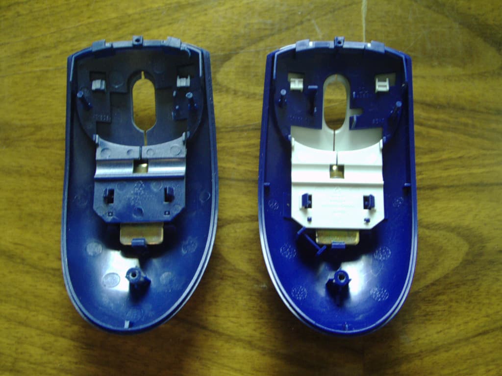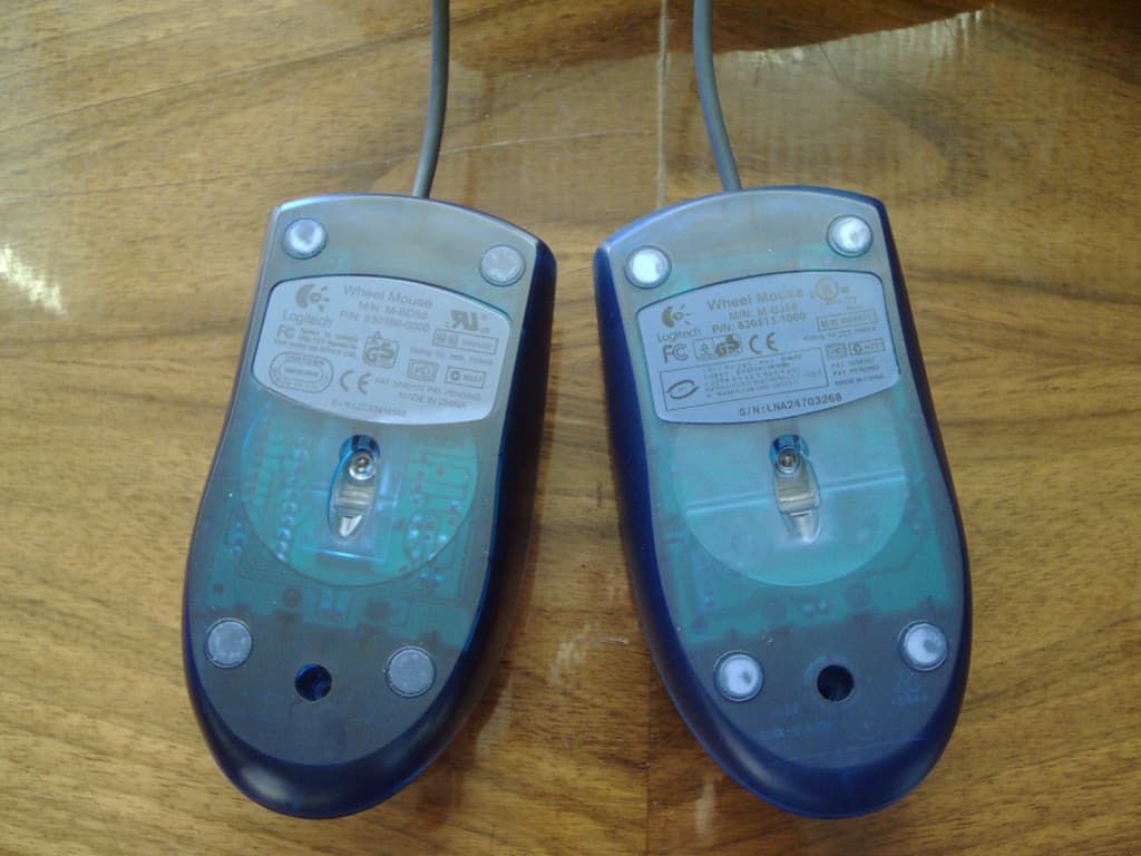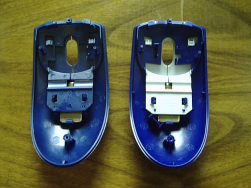 Как можно заметить на фотографиях, темно-синий, с голубоватым отливом, корпус оригинальной мышки чуть-чуть светлее, чем у подделок. Серебристое вкрапление, так же, более насыщенное. Оценивая окрас оригинальной мышки в общем, можно сказать, что имеет место эффект объема, тогда как у подделки он практически отсутствует. Но, еще раз напомню, что всю разницу в окраске корпуса можно заметить только при хорошем дневном освещении. По сравнению с прошлыми временами, налицо явный прогресс, ибо раньше, окрас корпусов был намного проще, но все равно различался. Это хорошо заметно на фотографиях взятых мною из упомянутого выше аналитического материала распространенного Logitech в 1999 году.