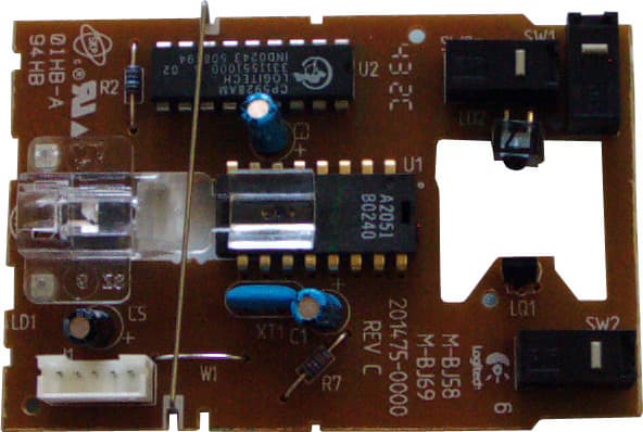 Разница печатных плат Logitech и подделки просто разительна. Подделка отличается не только отсутствием логотипа Logitech, но практически всем, кроме габаритов. Разные и чипы, и места их установки, и количество пассивных элементов электрической схемы. В общем, как и в случае с микропереключателями, словесное описание тут излишне — достаточно посмотреть на фотографии.