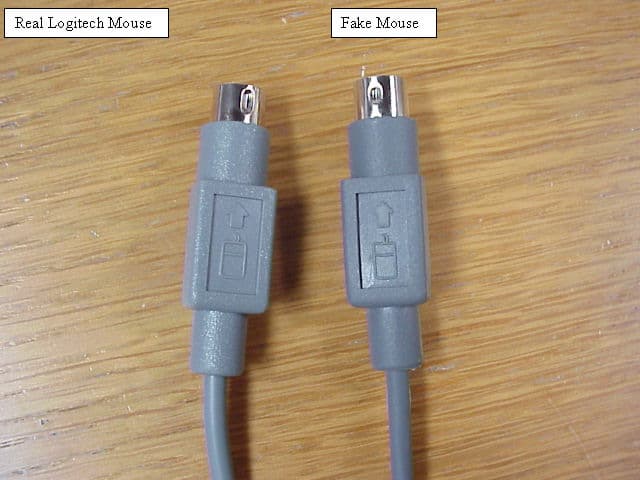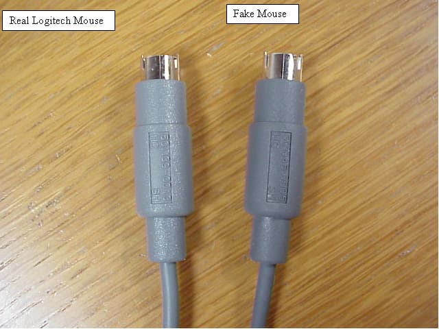 Как видите, корпус разъема оригинальных мышек Logitech гораздо изящнее прямоугольного корпуса подделок. Все это очень странно, ибо в былые времена, никакой разницы в форме корпусов интерфейсных разъемов между оригинальными мышками и подделками не существовало. В качестве свидетельства тому, можно привести фотографии из аналитического материала Logitech, в котором некогда рассматривалась мышь Logitech Pilot Mouse PS/2 (M-S35) и ее подделка.