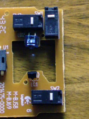 Ну, о микропереключателях, установленных под функциональными кнопками мыши, и писать нечего. Было бы очень глупо предполагать, что изготовитель подделки использует ту же их марку, что и Logitech. Остается только взглянуть на фотографии.