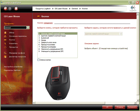 Здесь переназначаются кнопки мыши. Помимо обширного списка предустановленных функций, возможно присвоение кнопкам макросов и комбинаций клавиш, так что выбор будет достаточен для самого изощрённого пользователя.