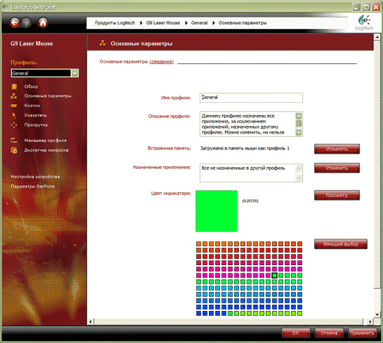 Здесь можно воспользоваться дивной новацией именно этой мыши, не имеющей даже аналогов назначить цвет светодиодного индикатора, один из 180 предустановленных. Это не «глюк» сжатия картинки, цвета действительно очень трудно различить по представлению в этом диалоге. Но индицируются три их координаты в RGB по шкале от 0 до 255, да и при использовании кнопки «применить» можно наглядно увидеть цвет на мышке. Они на самом деле все разные. Помимо чисто эстетического наслаждения, функция несёт и полезную нагрузку при помощи цвета можно определить активный профиль и ориентироваться при их переключении. Яркость свечения не регулируется, на мой взгляд оптимальная видно чётко при ярком свете, но в темноте ночником не служит и, будучи рядом с монитором, фильмы смотреть не мешает.