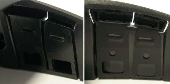 Крепление корпуса на мышь происходит путём совмещения их передних частей, после чего сзади накладка опускается вниз до щелчка. Снимается она после нажатия на кнопку, смещающую две защёлки в задней части. Всё происходит легко и естественно, фиксация надёжная, люфт отсутствует.