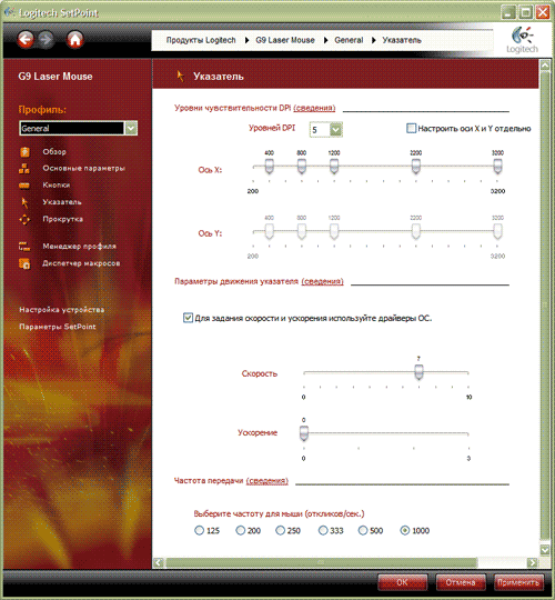 Здесь собраны настройки, влияющие на ходовые характеристики манипулятора. Возможность ограничить частоту опроса порта будет не лишней для пользователей старых машин при активном перемещении курсора загрузка Pentium 4 3 ГГц составляет до 15%, если частота опроса порта выставлена в 1000 Гц. Чувствительность можно выставлять любую от 200 до 3200 dpi с шагом в 200 единиц. Можно задать до пяти точек фиксированной настройки, между которыми можно переключаться при помощи соответствующих клавиш «на лету». Также для этих точек возможно определение разной чувствительности по осям X&Y. Напомню, что для каждого профиля настройки свои.