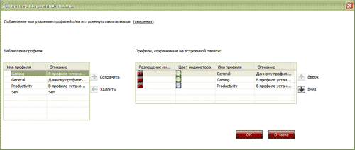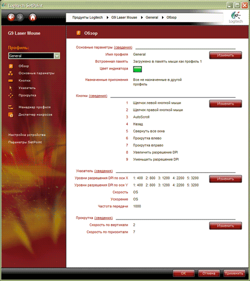 Доступен такой путь управления настройками для профилей, сохранённых в памяти мыши. Кроме трёх встроенных, туда можно записать ещё два. А встроенные можно переконфигурировать. Так что получается пять полностью разных, полностью настраиваемых сетов. Притом работать они будут на любом ПК под управлением Windows XP или Vista в полном объёме, а с другими ОС частично. Переключение производится той же качалкой, что и переключение разрешения, но с нажатой специальной клавишей на брюшке.