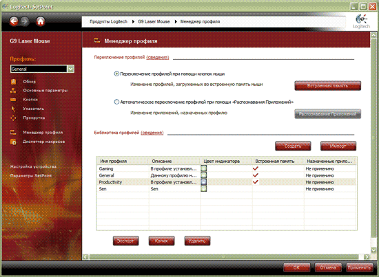 Так происходит, пока мышь подключена к «родительской» машине, т.е. той, где её сконфигурировали в первый раз, или к любой другой, на которой не установлен SetPoint. Если же её подключить к другой машине с установленными драйверами, то будет задан вопрос, сохранить настройки или изменить. При первом выборе управлять мышью из драйвера будет нельзя. При втором будут потеряны все сохранённые в её встроенной памяти профили. Которые, впрочем, легко восстановить на «родительской» машине. Только не сохраняйте ничего под именем General этот профиль не может быть перезаписан.