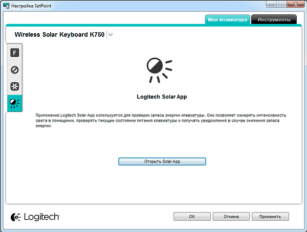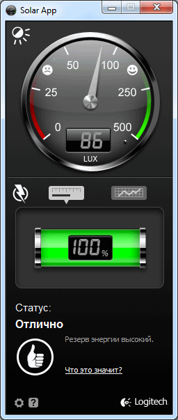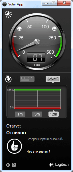 Для контроля работы солнечных батарей предусмотрена программа Logitech Solar App. Устанавливается она отдельно от SetPoint, но может быть вызвана непосредственно оттуда.