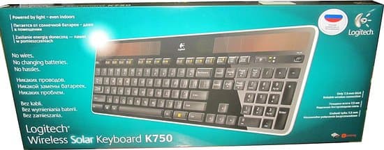 Коробка с изображением клавиатуры оформлена в традиционных для Logitech зеленых тонах. Интересным элементом оформления выглядит «подсветка» слова «Solar», намекающая на технологическую особенность устройства и отделяющая Logitech Wireless Solar Keyboard от Logitech Wireless Illuminated Keyboard. Пояснительные надписи на нескольких языках включают русский.