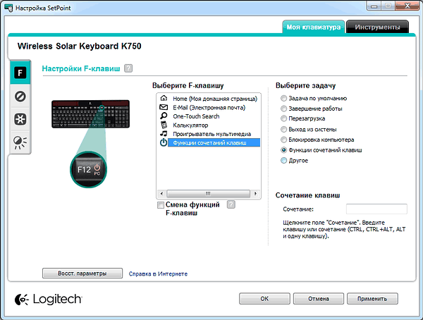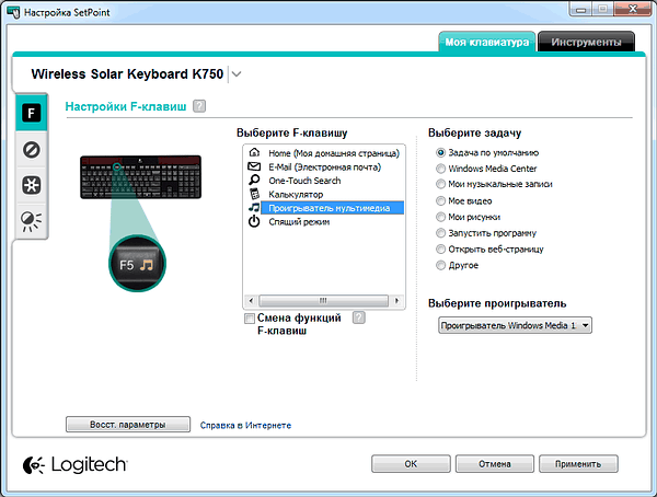 Выделенные дополнительные кнопки у Wireless Solar Keyboard отсутствуют, поэтому пользователю доступны только сочетания функциональных кнопок (настроить можно только 6 из них) с кнопкой FN, при этом функции F-клавиш по умолчанию могут быть инвертированы.