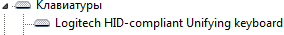 После установки клавиатура определяется в соответствующем разделе диспетчера устройств как Logitech HID-compliant Unifying keyboard.