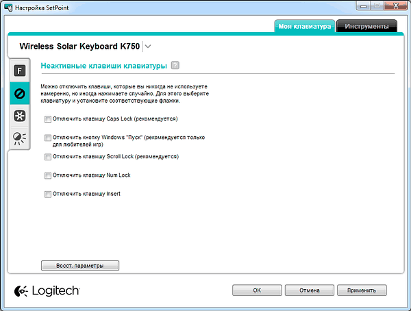 SetPoint позволяет отключить кнопки Caps Lock, Windows, Scroll Lock, Num Lock и Insert.
