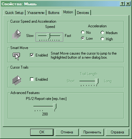 Четвертая закладка несет мало нового по сравнению со стандартными свойствами мыши, но изменения есть. В частности, можно не только плавно настраивать скорость перемещения курсора, но и настройка динамического изменения скорости хоть какая-то появилась (не все производители дают возможность настроить это, кстати). Также, что уже стало традиционным для MouseWare, имеется возможность регулировать частоту опроса в случае порта PS/2. Пользователям Windows XP это не особо-то и нужно, поскольку достигается и стандартными средствами, а вот владельцам более старых версий окажется совсем не лишним (особенно в случае Windows 2000, где PS2Rate не работает, так что приходится редактировать системный реестр).