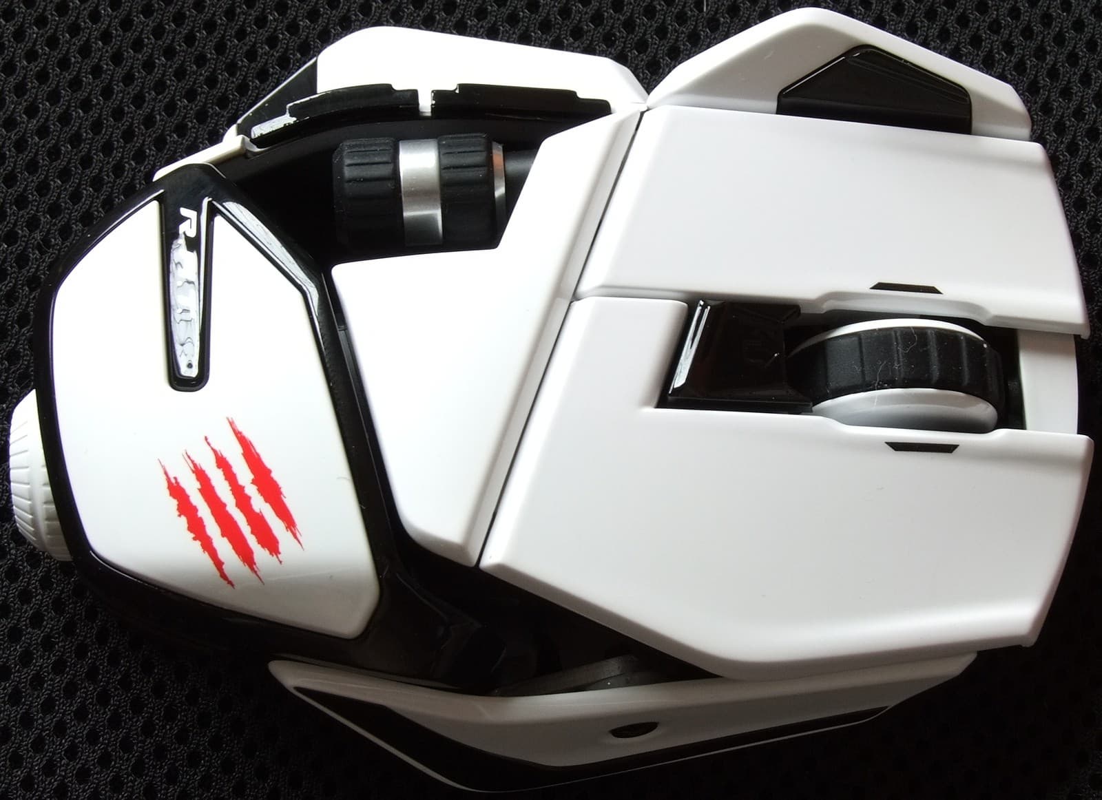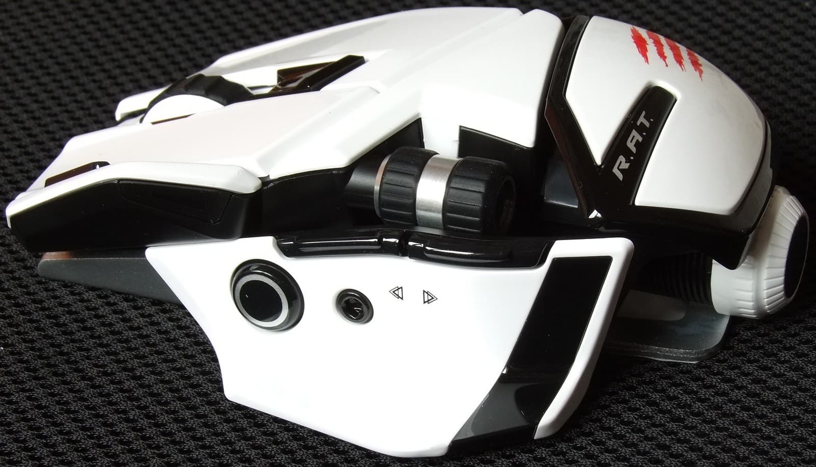 С левой стороны предусмотрена площадка для большого пальца, там же находятся дополнительные кнопки — две узких и круглая, по умолчанию снижающая чувствительность сенсора (т. н. снайперский режим в игровых мышах у Mad Catz Office R.A.T. получил название точного управления).