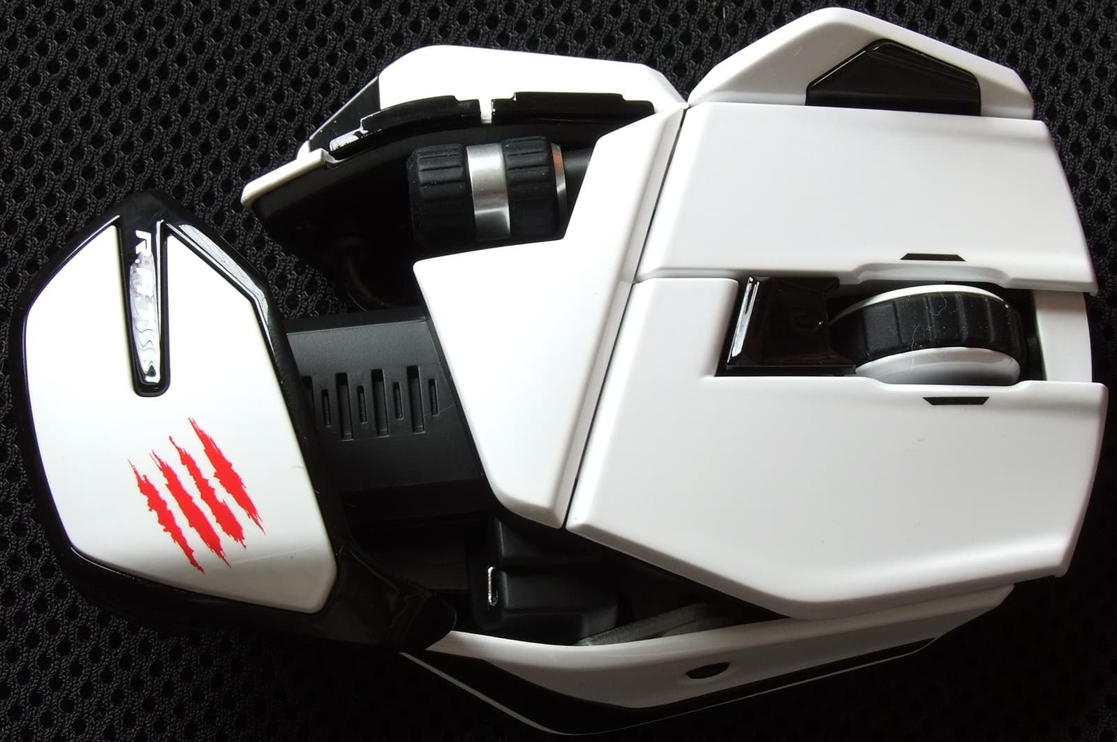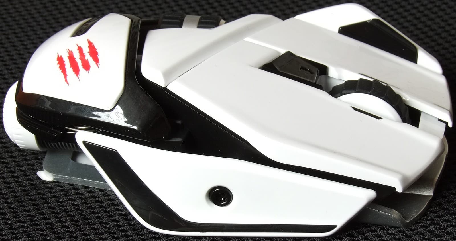 Особенностью игровых мышей Mad Catz является выступ возле левой кнопки, на внешней стороне которого у игровых мышей находится четырехсегментный индикатор выбранного разрешения, в нашем случае замененный на одноцветный синий индикатор работы Bluetooth.