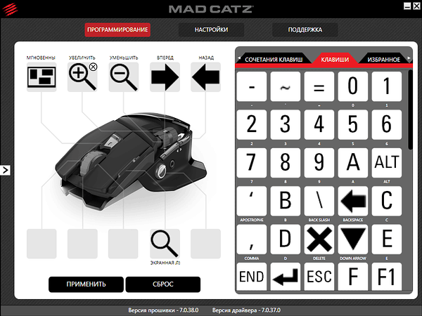 При тестировании использовались драйверы версии 7.0.37.0 и ПО (в локализованном варианте почему-то называемое «прошивкой» вместо «Software version», хотя возможности обновления таковой Mad Catz Office R.A.T. не имеет, как и встроенной памяти) версии 7.0.38.0.