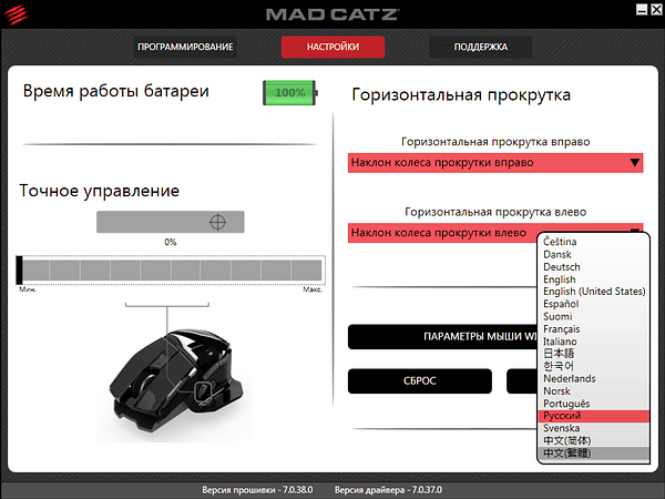 В руководстве по установке также обнаружен русский язык (впервые у попадавшей к нам до этого продукции Mad Catz), качество локализации в целом хорошее за исключением перевода «Horizontal Scroll» как «Горизонтальной полосы».