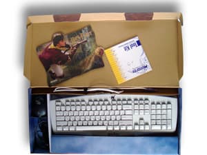 Итак, перед вами детский подарочный набор Гарри Поттера от Memorex. Картонная упаковка оформлена очень красочно, так что перепутать данный набор с каким-либо другим будет достаточно сложно. В общем-то, все компоненты, входящие в этот набор, изображены на лицевой стороне упаковки, но не так, чтобы это бросалось в глаза. Так что же не бросается нам, потенциальным покупателям, в глаза? Комплект! Да, хоть и незначительно, но он отличается от большинства современных наборов клавиатура + мышь. Отличается, конечно же, в лучшую сторону. Что обычно входит в основной состав таких комплектов? Клавиатура, подставка под запястья, присоединяемая к клавиатуре, и мышь. Диски с драйверами и прочие руководства пользователя можно не брать в расчет, так как они сопровождают практически любые покупаемые в магазине компьютерные комплектующие. Данный же набор чуть-чуть более богат и включает в себя буквально следующее: