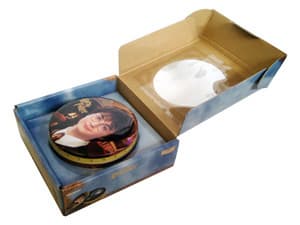 Внутри первой, картонной коробки обнаруживается вторая. Но, в отличие от внешней упаковки, вторая коробка уже круглой формы и металлическая. Она очень напоминает красивые железные банки, в которых продаются различные печенья и прочие сладости. Так вот, именно эту металлическую коробку и видно через прозрачное пластиковое окошко внешней картонной упаковки. И именно на ней и нанесено изображение и логотип Гарри Поттера. Круглая коробка фиксируется специальной картонной вставкой, под которой так же уложен диск с драйвером и программным обеспечением мыши. Продолжая исследование, открываем и эту коробку, или банку, как вам больше нравится.