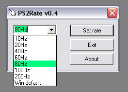 Для «стареньких» операционных систем типа Windows 95/98/ME очень хорошей программой, позволявшей осуществлять повышение (равно как и понижение) частоты опроса мыши была утилита PS2Rate. Она давала возможность пользователю менять частоту опроса манипулятора, подключенного к порту PS/2, в пределах от 10 до 200 Гц (дискретно, о чем сказано ранее). Утилита была удобна и проста в использовании, однако, к сожалению, работала далеко не со всеми материнскими платами (виноваты были, конечно же, разработчики последних).