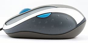 Внешний вид вполне привычен для портативных мышей от Microsoft, как формой, так и пестроватым оформлением. Спинка состоит из достаточно небольших кнопок, со всех сторон ограниченных неактивными областями серебристого цвета. У проводной модели кнопки совсем маленькие, у беспроводной размером больше, и не только за счёт того, что сама она больше, но и за счёт использования задней части. Впрочем, активная область для нажатия не сильно отличается по размерам. Само нажатие приятное, мягкое и информативное, с кликом умеренной громкости. Но ободок по краям и спереди сильно снижает удобство использования, по крайней мере, для большой руки. Ободок вокруг колеса, напротив, удобен — за него можно придерживать средним пальцем мышь при подъёме, там же он лежит, когда не работает с колесом. Само колесо узенькое, без клика при вращении, что для нас очень неудобно, об этом неоднократно написано. Привыкнуть к отсутствию дискретного поворота не удалось в течение достаточно длительного времени. Нажатие на кнопку под колесом чёткое и лёгкое, нажимать его надо вперёд, а не назад, как похожее на крупных мышах, например, на Wireless Laser Mouse 8000, которой мы пользуемся уже больше года. Боковые нажатия даются труднее, и при этом приходится придерживать мышь за противоположный борт для фиксации, возможно, даже немного меняя хват. Впрочем, и требуются они не очень часто. Только с левой стороны находится одна маленькая дополнительная кнопочка, что показалось нам очень странным решением. Конечно, не все используют две боковые кнопки, но всё же к одной большинство пользователей привыкли. Так что разместить и справа ещё одну было бы не лишним, особенно учитывая полностью симметричную форму мышей. В таком варианте они вполне подошли бы и под левую руку без потери функциональности. Надо ли говорить, что мизинцем оперировать дополнительной кнопкой значительно неудобнее, чем большим пальцем?