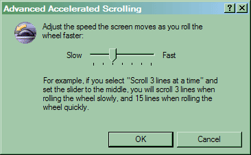 Что вообще представляет собой акселерация? Изначально этот термин был применим к движению курсора: при медленных движениях мыши его скорость была одной, а при быстрых ускорялась в зависимости от настроек. Т.е., к примеру, если медленно провести мышь 1 см, то и курсор передвигался на 1 см, а если быстро, то он пробегал уже 5 см по экрану (цифры абстрактные :)). В первых мышах с колесиком прокрутки ее скорость была постоянной. Сказано, что один шаг прокручивает три строки, значит три строки он и прокрутит. А десять шагов передвинут, соответственно, курсор на 30 строк, независимо от того, как быстро вы будете крутить колесико. Теперь же с колесиком происходит то же самое, что и при движении мыши: более быстрое его вращение вызывает резкое увеличение скорости прокрутки документа. Степень ускорения вы как раз и настраиваете в данном диалоге. Удобна ли вообще акселерация прокрутки? С одной стороны, кнопки PgUp/PgDn никто не отменял :) С другой же, перекладывать руку с мыши на клавиатуру не всегда удобно. Да и можно не включать данную опцию если она вам не нужна. В общем, от появления акселерации как минимум не стало хуже. А кому-то работать будет намного удобнее.