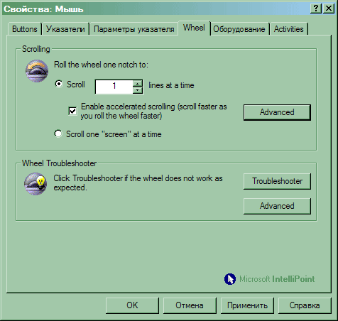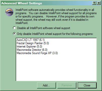 Кнопка Advanced подраздела Wheel Troubleshooter позволяет нам отключить использование колесика всюду или в определенных программах. Немаловажная возможность в конце-концов, очень многие современные программы и сами поддерживают колесико, причем наилучшим с точки зрения их разработчика способом, так что лучше довериться им и не пытать выполнять прокрутку средствами IntelliPoint (просто транслирующего соответствующие сообщения мыши в более привычные). Но есть еще и старые программы, из-за которых и нужна соответствующая предобработка. Появилась она в IntelliPoint не сразу (первая время прокрутка в мышах от Microsoft работала только в рассчитанных на их использование программах), кому не нужна может отключить.