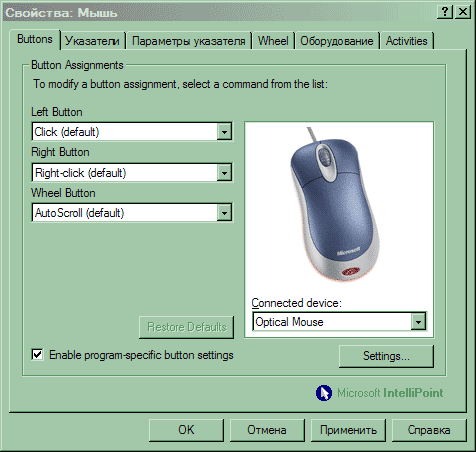 К сожалению, полнофункциональными макросами это считать нельзя: одна кнопка, возможно с модификатором (к сожалению, дополнительные клавиши мультимедийных клавиатур не распознаются, а то б я назадавал совместными усилиями IntelliPoint и KeyM@n :)). Однако горячие клавиши практически во всех программах на 90% таковые, так что все равно очень неплохо смотрится данная возможность. Но наибольшую гибкость и мощность программе дает малоприметный на первый взгляд чекбокс «Enable program-specific button settings». Пометим его и нажмем на кнопку Settings.