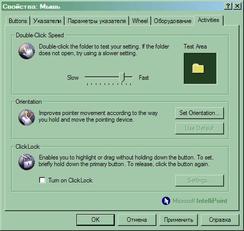Последняя закладка (Activities) предназначена для настройки скорости двойного щелчка, ориентации мыши в пространстве и «залипания» левой кнопки (очень удобно, если нужно часто выполнять перетаскивание). Появилась она уже давно, единственное найденное отличие изменилась машинка, которую нужно «протащить» мышью вверх при настройке ориентации :)