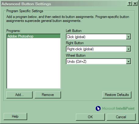 Вот он звездный час Intellipoint! В версиях 4.Х мы можем независимо от глобальных установок обеспечить специализированные настройки для своих любимых программ. Причем делается это просто добавляем программу в список и делаем настройки «лично» для нее. На иллюстрации показана спецнастройка для Photoshop: AutoScroll в этой программе фактически не нужен, а вот Undo используется очень часто. Почему бы не повесить его на среднюю кнопку? Работать это будет именно в Photoshop, а другие программы будут использовать свои собственные предпочтения (заданные их программистами или нами), либо «глобальные» значения кнопок. Благодаря этому, даже из трех стандартных кнопок можно извлечь немалую пользу, а уж про более развитых «грызунов» семейства и говорить-то нечего.
