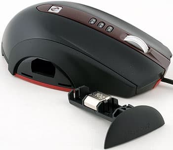 В мышку установлен лоток, его крышка — правый бок, фиксируется защёлкой, расположен по центру манипулятора строго поперёк. В него можно положить три грузика, в комплекте идут три штуки по десять грамм и один на пять грамм. Вес мыши составляет 125 грамм, таким образом максимальный вес — 155 грамм. Балансировку можно проводить только в поперечном направлении, тогда как у конкурентов обычно в продольном. Смысла в этом не усмотрели, так как мышь и так неплохо сбалансирована и вовсе не избыточно лёгкая.