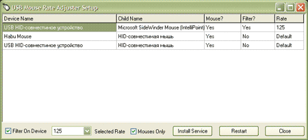 В связи с этим возник вопрос — можно ли снизить частоту опроса порта USB. Оказывается, это так же легко, как и увеличить её. Что ещё раз говорит о том, что данный параметр является следствием договорённости контроллера мыши и драйверов ОС о скорости обмена информацией. При этом лимитировать её может каждая из высоких договаривающихся сторон, как по неспособности на большее, так и по собственной прихоти. А повышать могут только совместными усилиями. Таким образом при использовании «патченного» драйвера скорость была снижена до 125 Гц, что подтвердилось всеми программами и личными ощущениями, совсем не приятными от такого ограничения. Но для владельцев старых машин выбор небольшой — отдавать мыши 10-30% процессорного времени не каждый согласится.