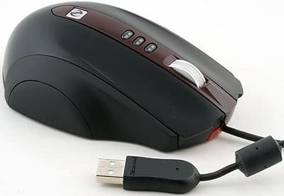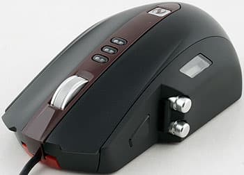 Боковинки мыши изготовлены из нескользкого пластика, спинка, объединённая с основными кнопками, — из матового пластика, всё чёрное. В глянцевой тёмно-коричневой вставке расположено колесо и четыре кнопки. Справа, у среза площадки для большого пальца размещены вертикально две металлические круглые кнопки, и ещё одна треугольная перед ними. Над пальцем, всегда на виду экранчик. Он показывает текущее разрешение и состояние записи макроса. Когда хочет — горит, когда нет — гаснет, без видимых причин. При этом текущее разрешение индицируется одной из трёх кнопок для его выбора, она горит всегда.
