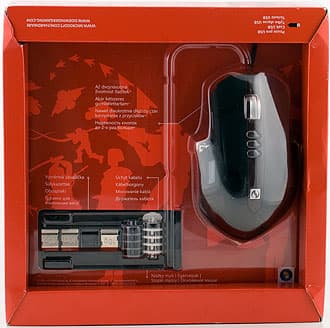 Симпатичная коробка в красных тонах украшена описаниями технических особенностей и рекламными лозунгами. В прозрачном блистере, в картонной обложке, сама мышь и картридж для грузиков на виду, внутри также диск с драйверами и некоторое количество печатной продукции. Все надписи на четырёх языках, русский присутствует. И ещё тяжёлая небольшая коробочка — держатель провода и по совместительству шкатулка для двух сменных комплектов «лапок» и тех самых грузиков.