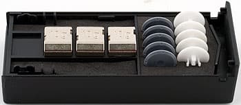 Три комплекта лапок крепятся на днище, на защёлке, легко ставятся на места и снимаются. По чёрному покрытию офисного стола лучше всего скользят белые, больше всего трение у серых, чёрные занимают промежуточное положение. Предоставляется возможность каждому выбрать наиболее подходящий вариант для своего коврика или стола. В качестве запасных расценивать лапки сложно — они монолитные и достаточно толстые, миллиметра полтора, вряд ли сносятся. Мышь неплохо скользит и на брюшке, вовсе без лапок. И ничто не мешает использовать тефлоновую самоклеящуюся плёнку, которой продаётся много. Так что тут всякий для себя найдёт подходящее решение.