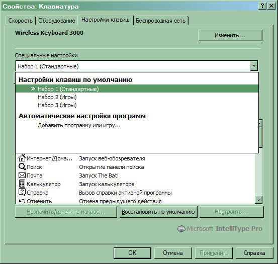 Несмотря на то, что каждая последующая версия Windows поддерживает все большее и большее количество дополнительных клавиш на клавиатуре (некоторые уже впору считать основными в результате), поддержка эта не всегда выглядит как надо. Когда кнопок много работают не все и не везде. Кроме того, штатный драйвер Windows не позволяет почти ничего настраивать, за исключением, разве что, кнопок управления питанием. Поэтому для большинства клавиатур по-прежнему обязательной операцией является установка специализированного программного обеспечения, написанного самим производителем клавиатуры или сторонней фирмой. Правилом хорошего тона в последнее время стала одна управляющая программа для всей выпускаемой фирмой периферии, однако Microsoft придерживается более консервативного подхода: одна программа предназначена только для клавиатур, вторая — для мыши. Скачиваются с сайта компании по-отдельности, имеют русские версии (наконец-то!), объем для Windows XP составляет по 13 МБ на каждую, что в целом немного с точки зрения сегодняшнего дня.